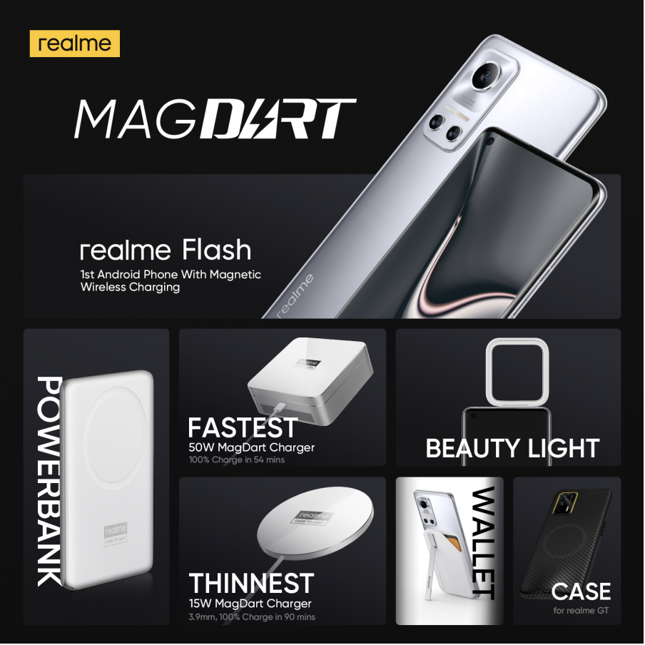 PETALING JAYA, 3rd August 2021 — realme, the world's fastest-growing smartphone brand, launches MagDart, the first magnetic wireless charging solution for Android. The solution includes the world’s fastest 50W magnetic wireless charger, realme Flash, the first Android smartphone that supports magnetic wireless charging, and several other magnetic charging accessories. realme aims to be a pioneer in the magnetic wireless charging ecosystem.